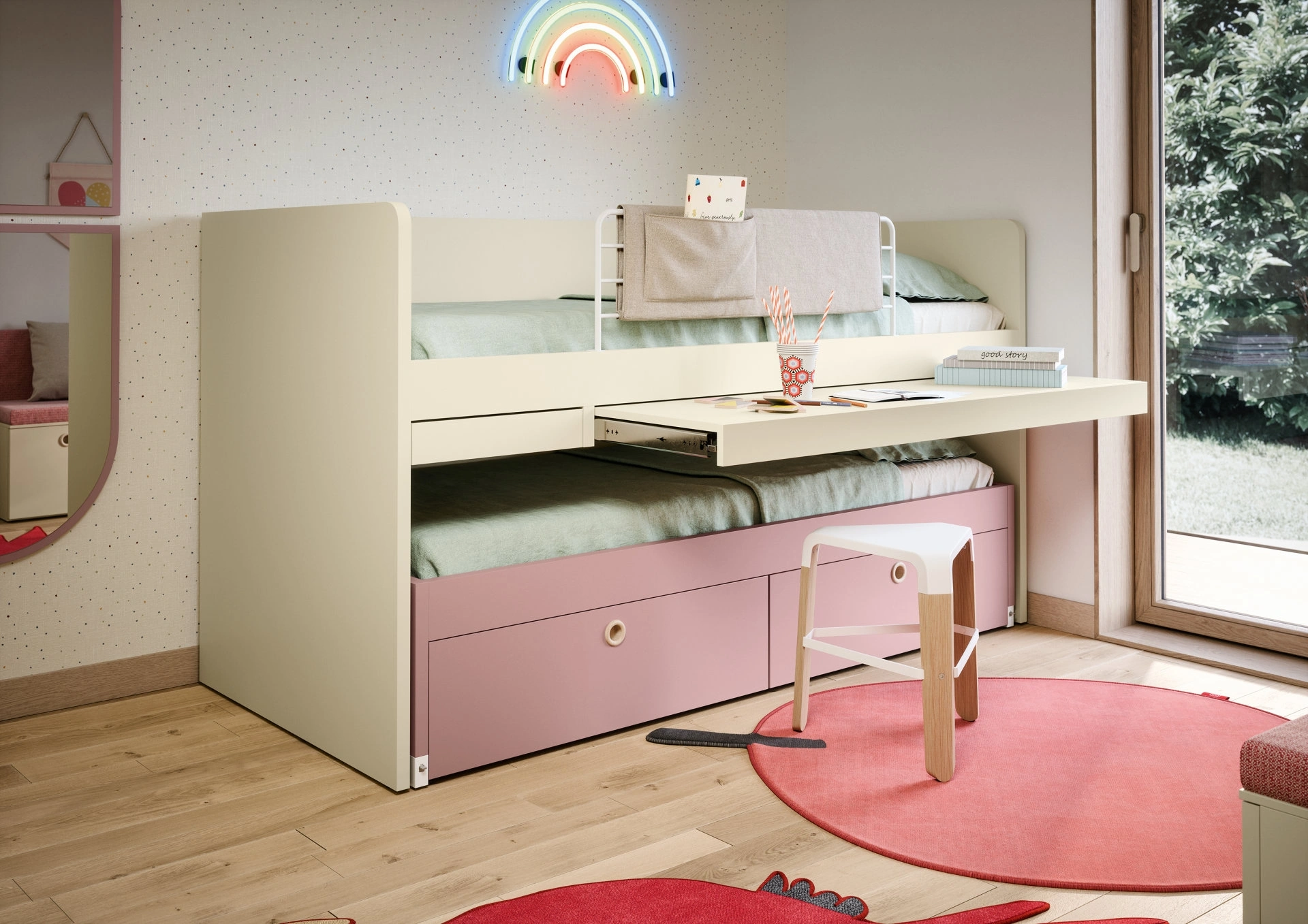 Se cerchi spunti creativi per progettare alla perfezione la stanza dei tuoi bambini, ti presentiamo la Cameretta Salvaspazio Turca di Nidi con finitura in melaminico. Nell'arredo della stanza dei bambini affidati a noi: in negozio presentiamo tutte le più originali composizioni moderne per la loro camera. Questa soluzione in melaminico ultima alla perfezione le doti pratiche e l'estetica della camaretta, poiché è capace di congiungere funzionalità ed ergonomia. Porta contenuto estetico e colori vivaci nella stanza dedicata ai più piccoli con questa proposta, una delle Camerette salvaspazio per bambine di Nidi.