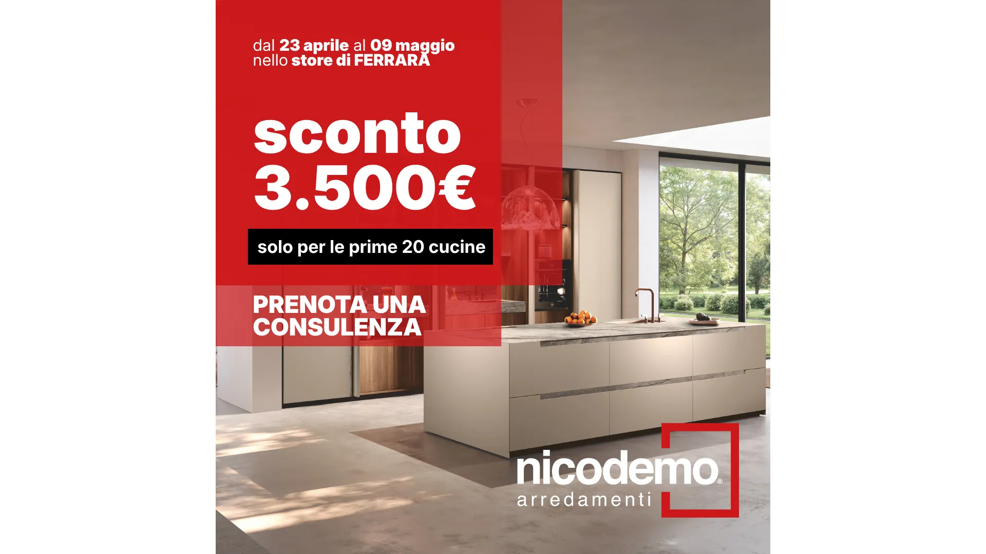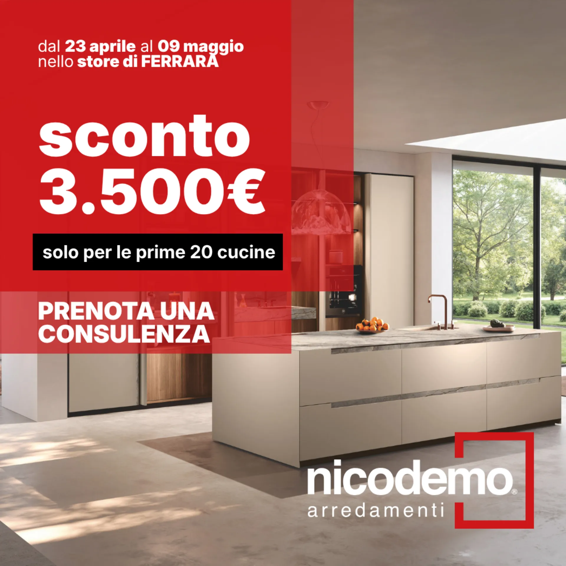 3.500 euro di sconto su tutte le nostre cucine. Il minimo di ordine a cui la promo fa riferimento è di 6.900 euro.